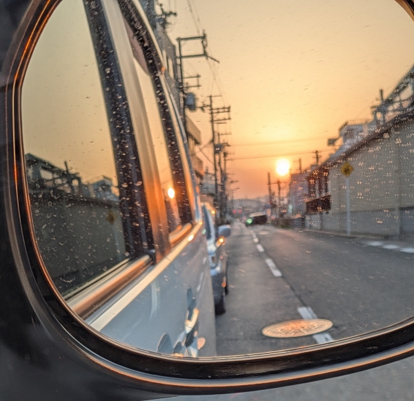 バックミラー越しの夕日が