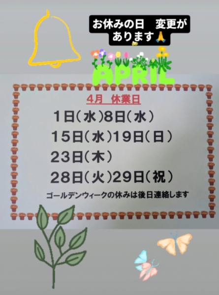 4月のお休みが少しかわりましたので お知らせします🙏
