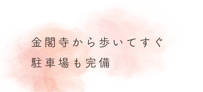当店は、多くの観光客で賑わう金閣寺から歩いてすぐの好立地。店舗の前には専用のガレージを構えており、駐車スペースを2台分ご用意しています。ちょっと休憩したい時に気軽にお立ち寄りいただければ嬉しい限りです。